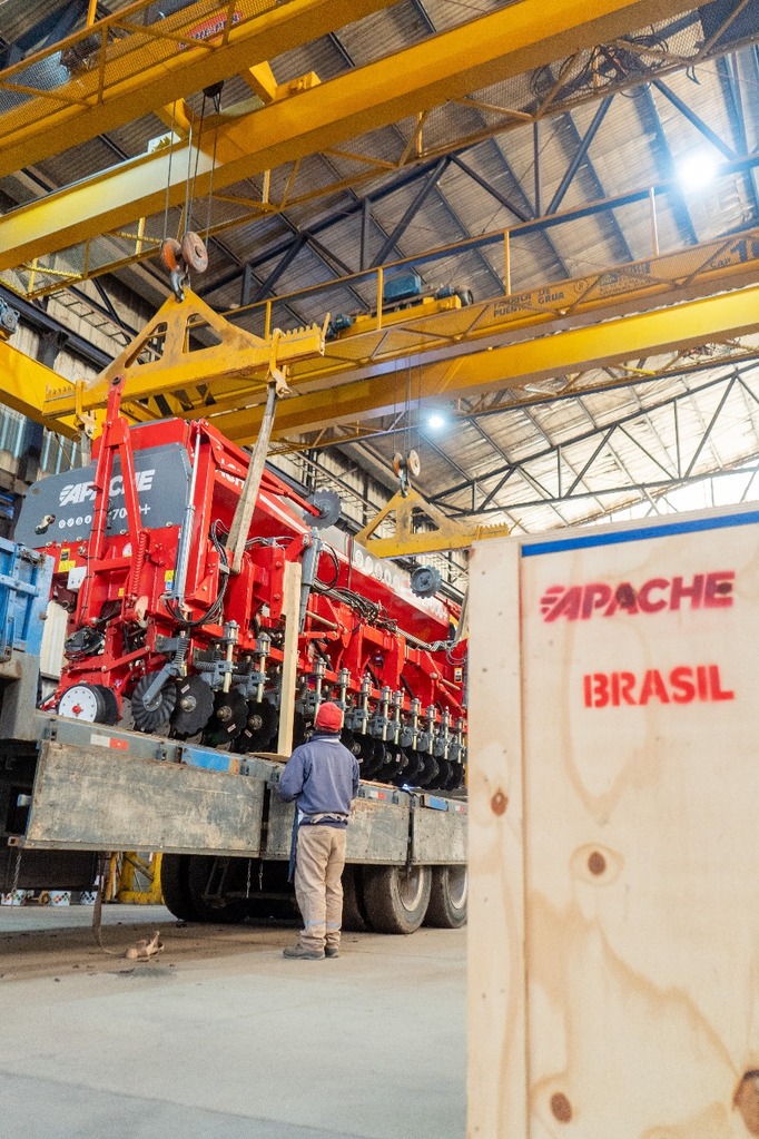 La empresa de Las Parejas, Apache S. A., referente en la fabricación de maquinaria agrícola, ha concretado un envío estratégico a Brasil: una sembradora del modelo 27.000 +, adaptada a las necesidades específicas del mercado local, con el objetivo de iniciar un proyecto de complementación industrial.