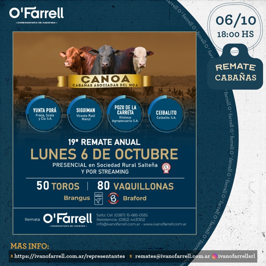 Este lunes 6 de octubre, a las 18 horas, las cabañas que integran Cabañas Asociadas del NOA (Canoa) -Yunta Porá, Sigüiman, Pozo de la Carreta y Ceibalito- realizarán su 19° remate anual, con transmisión presencial desde la Sociedad Rural Salteña y por streaming.