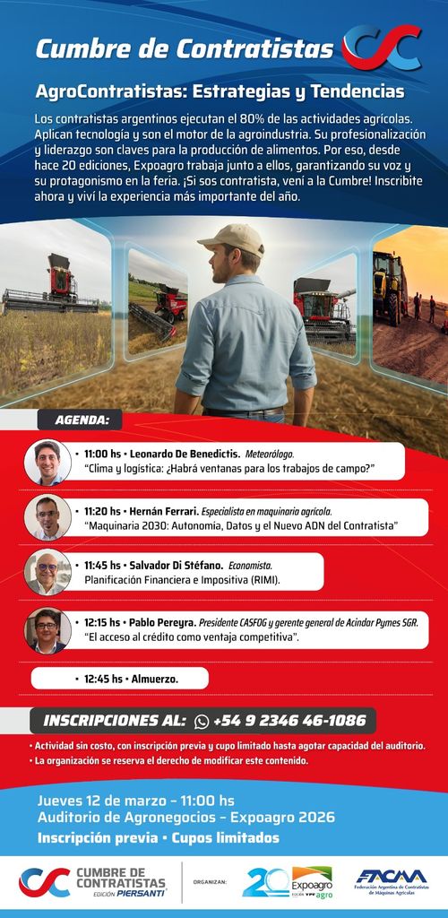 A la espera de mejores condiciones de financiamiento y una mejora en la rentabilidad, los contratistas rurales proyectan inversiones en maquinaria y tecnología con vistas a la próxima campaña. En ese contexto, el sector tendrá por primera vez un espacio propio dentro de Expoagro: la Cumbre de Contratistas edición Piersanti, organizada por Facma y Expoagro.