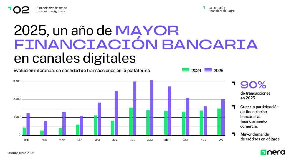 “Durante 2025 vimos cambios significativos en materia de financiamiento del agro, marcados por una mayor participación del sistema bancario frente al crédito comercial tradicional y por la consolidación del dólar como moneda de preferencia del productor”, señaló Marcos Herbin, CEO de Nera.