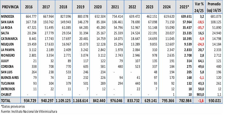 Mendoza aportó más del 80% de ese volumen, seguida por San Juan, La Rioja y Salta, que cosechó 23.335 quintales, mostrando un incremento del 16,5% interanual y consolidando su posición como la principal productora del norte argentino.
