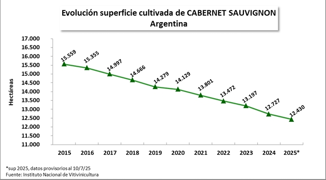 La variedad Cabernet Sauvignon, una de las cepas tintas más emblemáticas del mundo, continúa retrocediendo en los viñedos argentinos. Es que, según datos preliminares del Instituto Nacional de Vitivinicultura (INV), en 2025 la superficie cultivada totaliza 12.430 hectáreas, lo que representa el 6,2% del total de vid del país. En el período 2016-2025, la caída acumulada alcanza el 19,1%, evidenciando una tendencia sostenida de contracción.