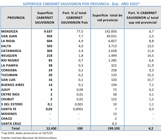 Pese a ello, el Cabernet Sauvignon sigue siendo la cuarta variedad más plantada de Argentina, detrás de Malbec, Cereza y Bonarda.