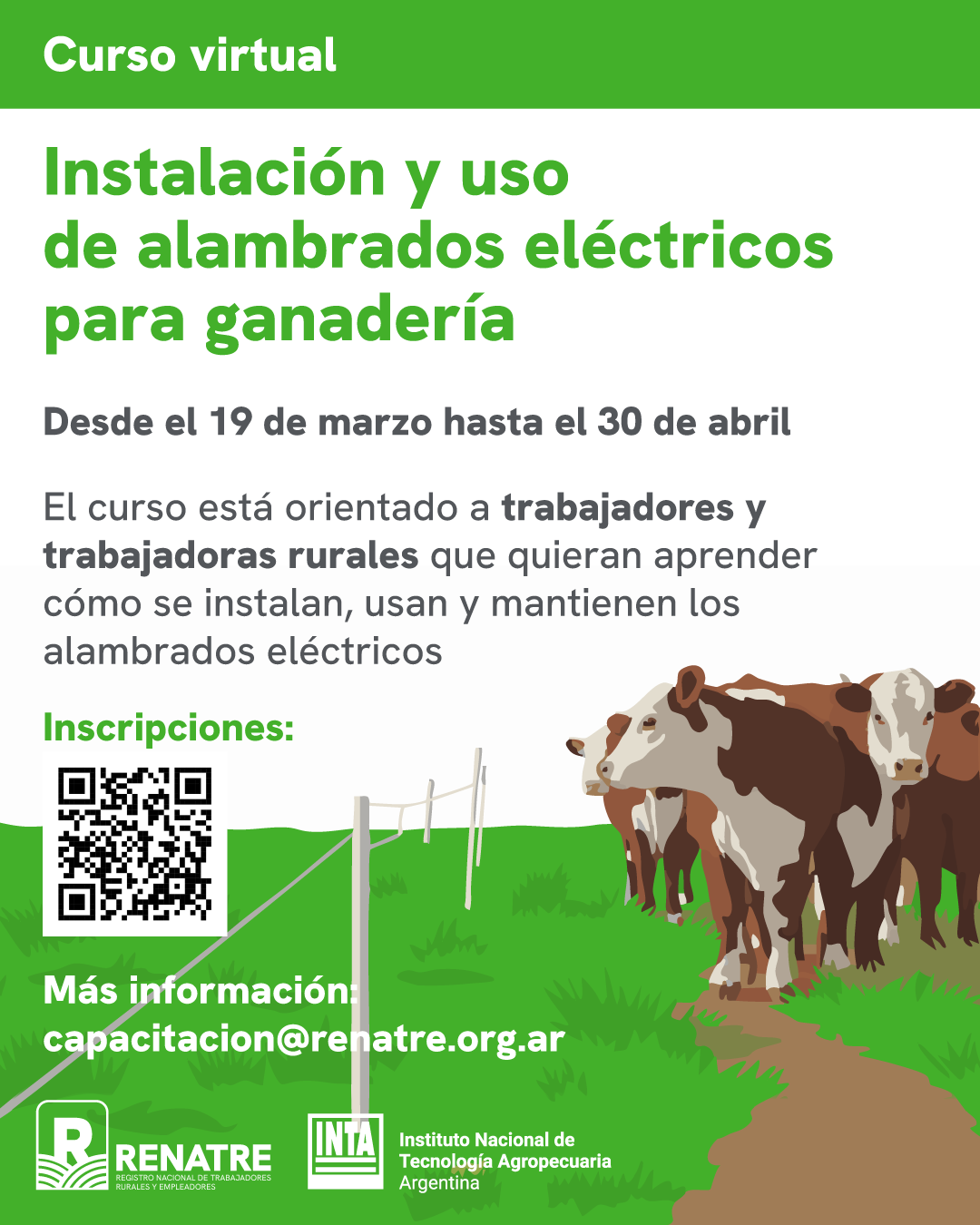 La capacitación se desarrollará entre el 19 de marzo y el 30 de abril de 2026, y estará a cargo de la Sede Central del organismo, con base en la Ciudad Autónoma de Buenos Aires. Durante el cursado, los participantes podrán adquirir conocimientos sobre instalación, uso adecuado y mantenimiento de alambrados eléctricos, una tecnología cada vez más utilizada en la ganadería moderna.