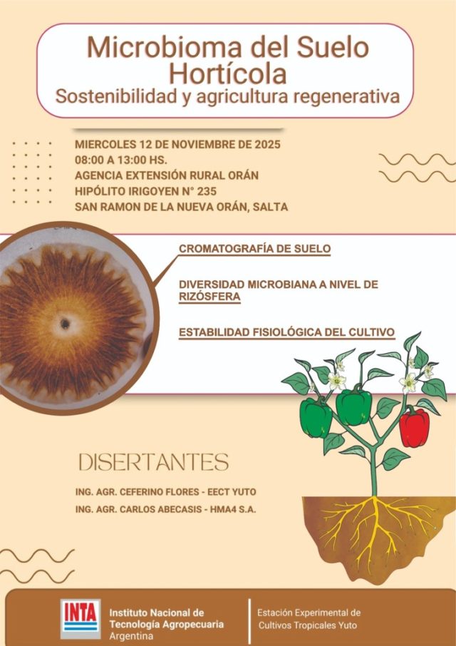 La jornada contará con la participación de los ingenieros agrónomos Ceferino Flores, de la Estación Experimental de Cultivos Tropicales Yuto (INTA), y Carlos Abecasis, de HMA4 S.A., quienes compartirán experiencias de campo y enfoques metodológicos para conocer en profundidad la dinámica microbiana en suelos hortícolas.