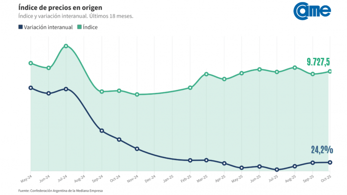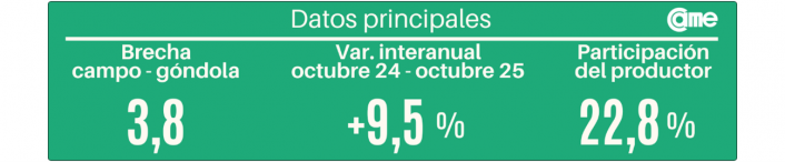 Por cada peso ($ 1) que obtuvo el productor, el consumidor pagó $ 3,8 en góndola, lo que representó un incremento interanual del 9,5% en la relación de precios. Por otro lado, en promedio, la participación del productor explicó el 22,8% de los precios de venta final, 0,8 puntos porcentuales por encima del mes anterior.