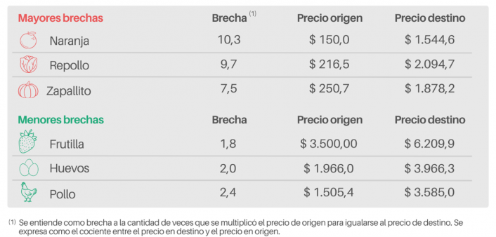 En cuanto al valor unitario de las brechas, los productos que registraron la mayor distancia de precios entre origen y destino fueron la naranja (10,3 veces), el repollo (9,7) y el zapallito (7,5 veces). En contraposición, la menor se observó en las frutillas (1,8 veces), los huevos (2) y el pollo (2,4 veces).