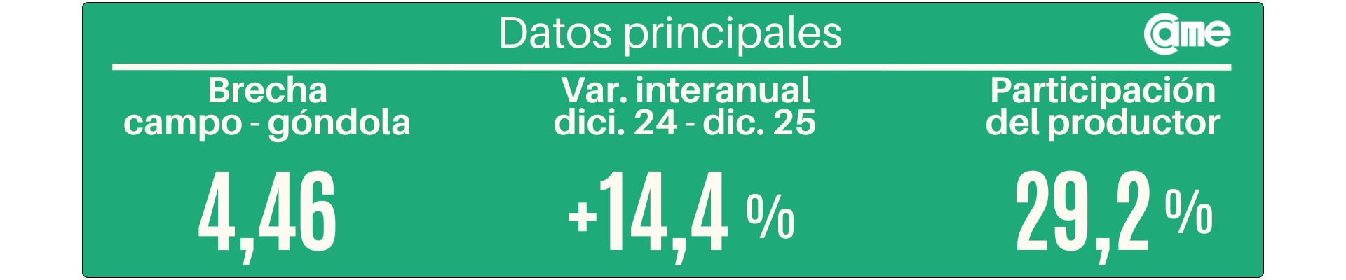 Por cada peso ($1) que obtuvo el productor, el consumidor pagó $4,46 en góndola, lo que representa un incremento interanual del 14,4% en la relación de precios.