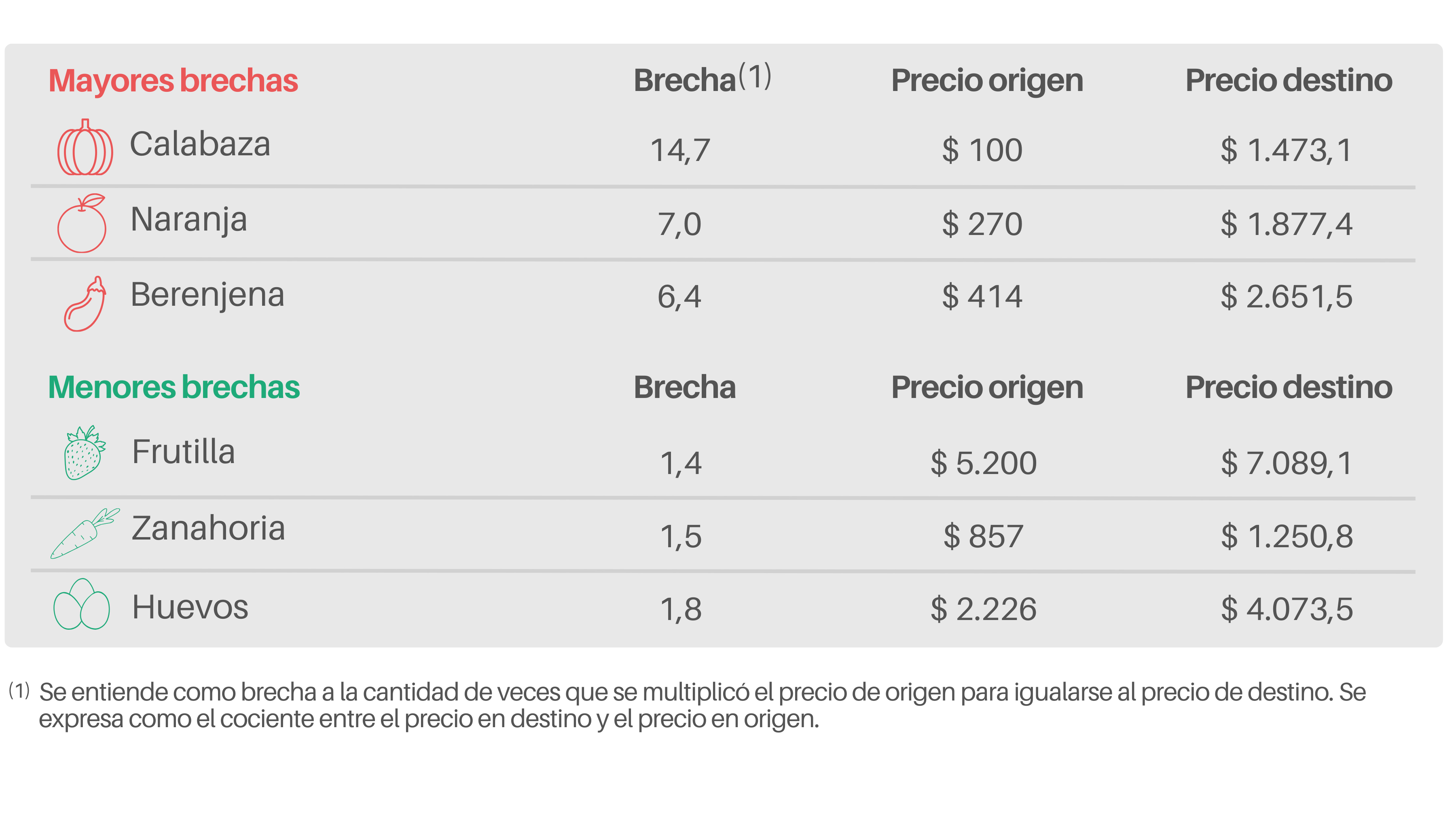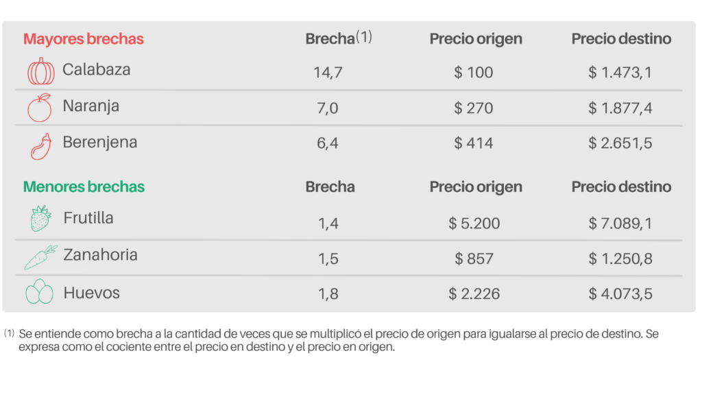 En cuanto al valor unitario de las brechas, los productos que registraron la mayor distancia de precios entre origen y destino fueron la calabaza (14,7 veces), la naranja (7) y la berenjena (6,4); mientras que la menor se observó en la frutilla (1,4), la zanahoria (1,5) y los huevos (1,8).