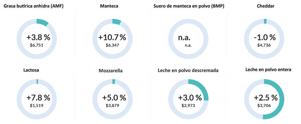 “La leche en polvo entera subió 2,5% permitió alcanzar un valor de 3.706 dólares la tonelada mientras que la leche en polvo descremada aumentó 3% hasta 2.973 dólares la tonelada” precisaron periodistas especializados del portal web Todo Lechería y concluyeron que “la manteca y la lactosa fueron los productos que más crecieron, con subas del 10,7% y 7,8%, respectivamente, mientras que el queso Cheddar registró, entre todos los productos, una leve baja, del 1%”.