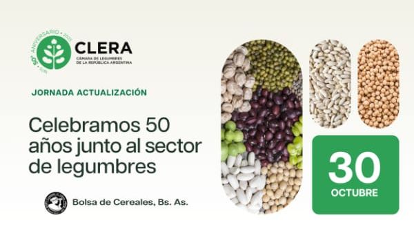 La Cámara de Legumbres de la República Argentina (Clera) celebra este jueves su 50° aniversario con una nueva Jornada de Actualización Técnica que reunirá a productores, exportadores, técnicos y referentes de toda la cadena de valor. El encuentro se desarrollará en la Bolsa de Cereales de Buenos Aires y también contará con transmisión en vivo vía streaming para facilitar la participación federal.