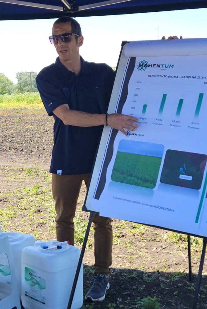 Dentro del área de nutrición, la empresa trabaja con formulaciones basadas en nanotecnología que permiten utilizar dosis reducidas. Uno de los productos mencionados es Momentum, de base nitrogenada y con incorporación de meso y micronutrientes. De acuerdo con la empresa, su uso fue evaluado durante más de tres años en cultivos extensivos como trigo, cebada, maíz, girasol y soja, y actualmente se amplía a verdeos y forrajeras.